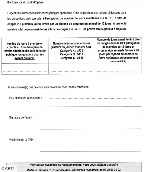 Un document nominatif doit être envoyé à chaque agent, il précise le solde actuel du CET avec l'alimentation faite au titre de l'année 2023. chaque agent doit ensuite faire son choix (indemnisation, maintien en CET...) et retourner ce document pour le 15 mars 2024 dernier délai.