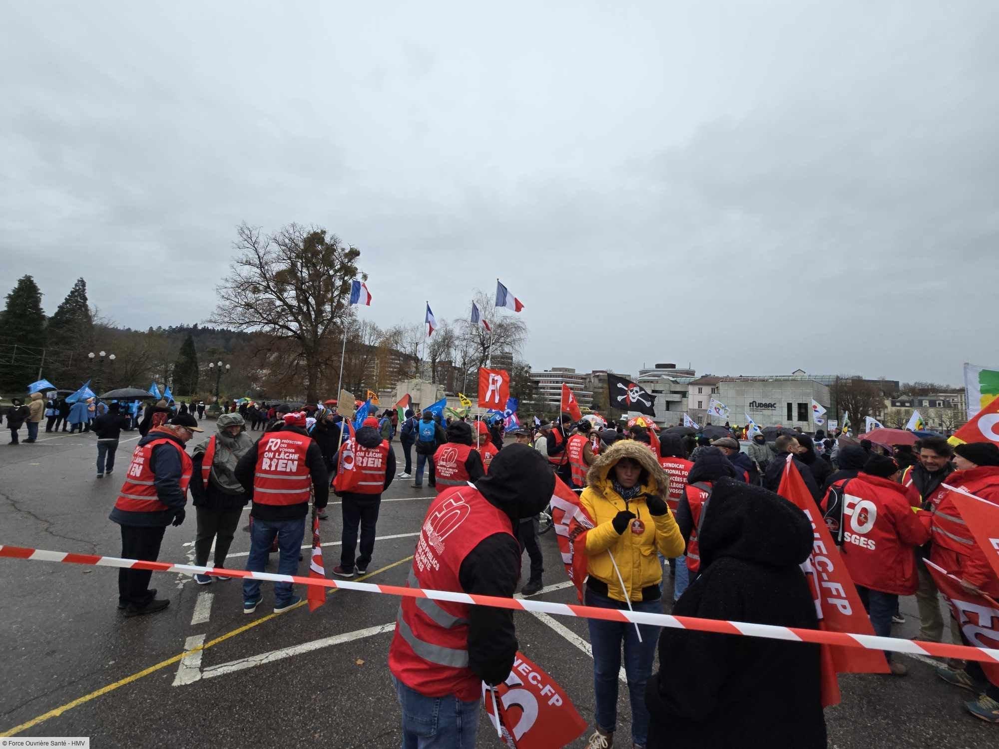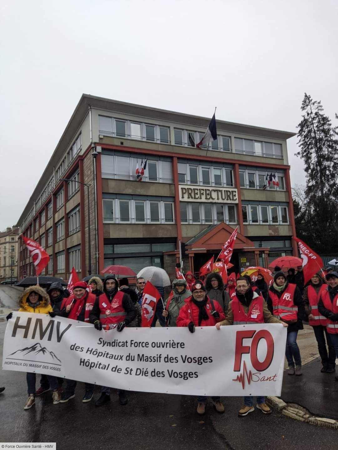 L’après-midi, l’élan intersyndical s’est poursuivi à Épinal où, à l’appel de l’intersyndicale, un rassemblement a été organisé devant la préfecture. FO Santé des Hôpitaux du Massif des Vosges (HMV) était pleinement représentée, avec plusieurs membres actifs venus prêter main forte malgré des conditions météorologiques difficiles. Sous le froid, la pluie, et même quelques flocons de neige, nous avons tenu à affirmer haut et fort : non à la précarisation de nos métiers, non au fonctionnement "au rabais" ! Nous refusons d’être la dernière roue du carrosse d’un service public qui, pourtant, est vital pour la société tout entière.