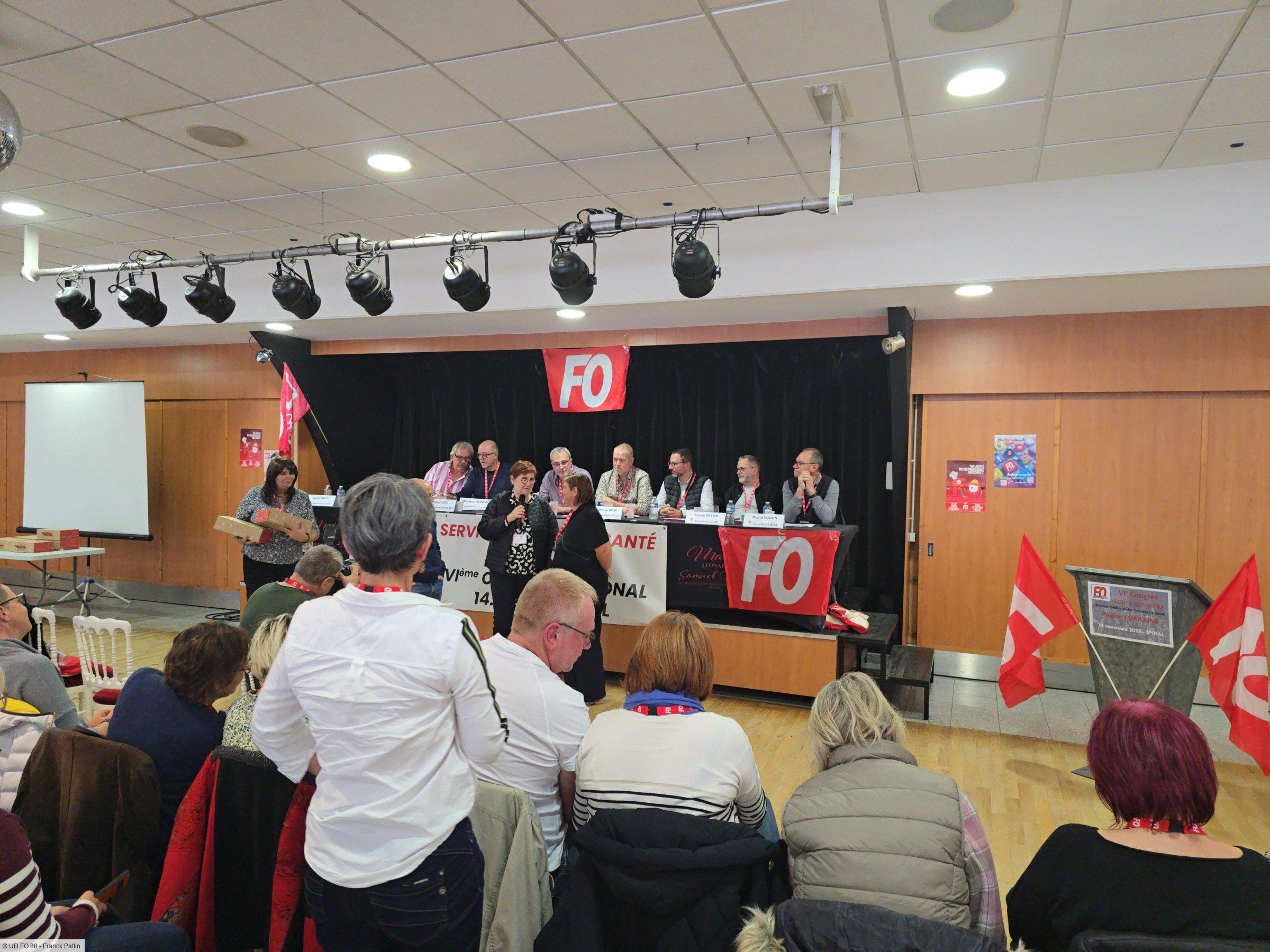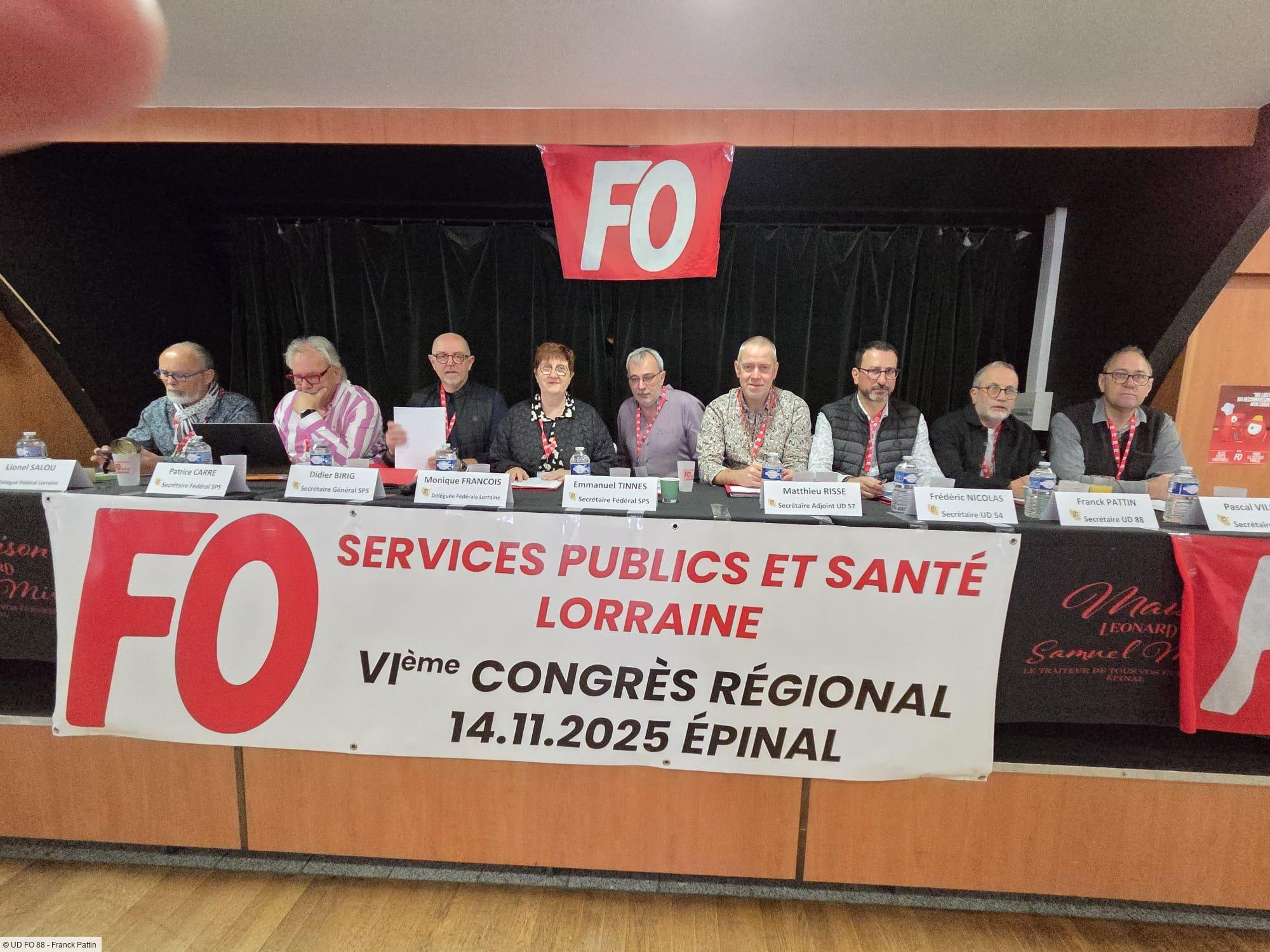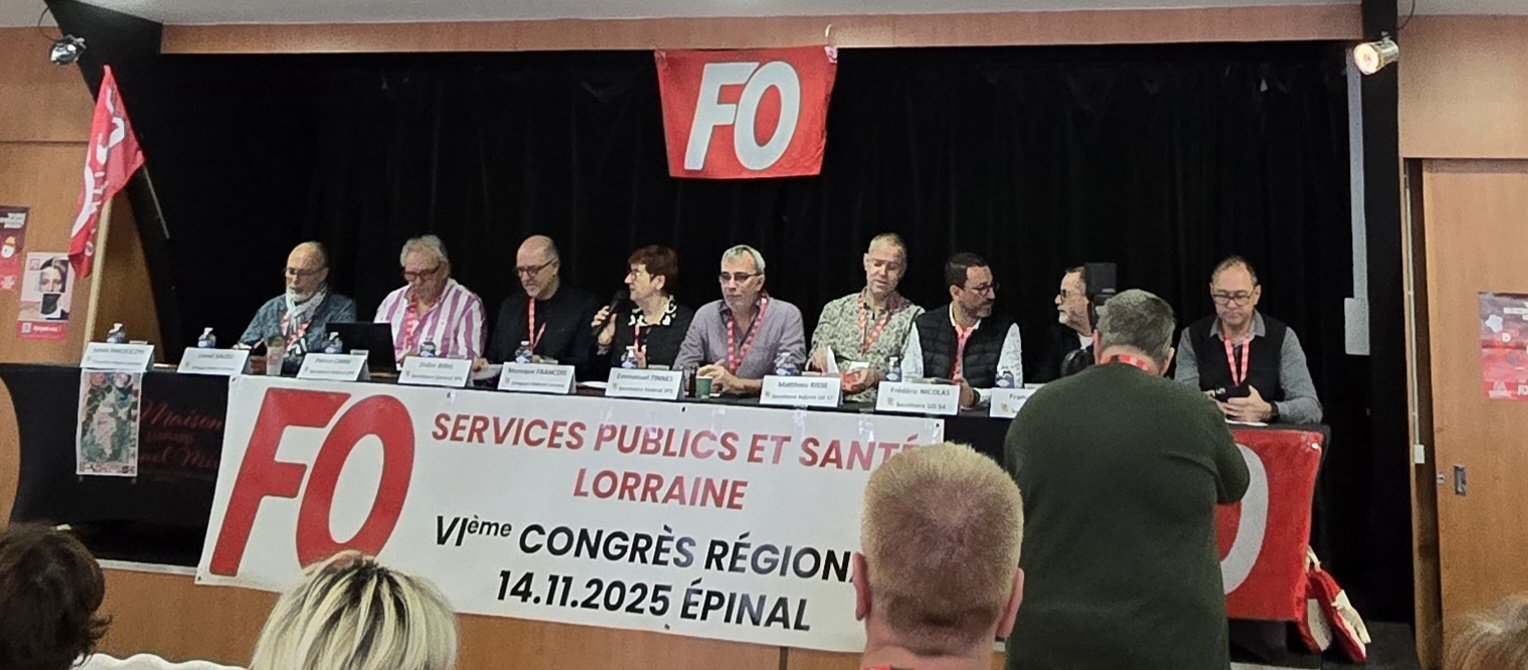 Le 14 novembre 2025, le Palais des Congrès d'Épinal a accueilli le Congrès Régional Force Ouvrière des Services Publics et des Services de Santé regroupant plus de 130 participants. Une journée forte en échanges, présidée par Didier Birig, Secrétaire Général FO SPSS, accompagné d'Emmanuel Tinnes, secrétaire fédéral, et de Patrice Carré, secrétaire fédéral aux Services Publics. Les secrétaires des Unions Départementales des Vosges, de la Meuse, de Meurthe-et-Moselle et de la Moselle étaient également présents, témoignant de la vitalité de l'organisation en Lorraine.