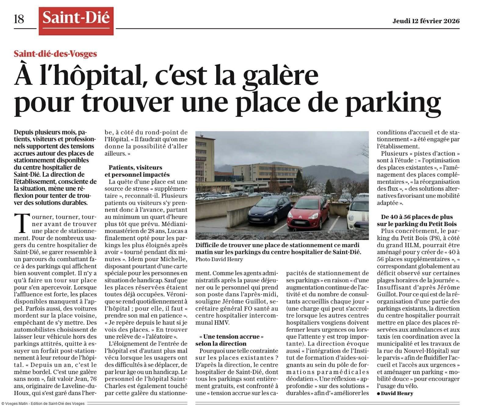 Depuis plusieurs mois, patients, visiteurs et professionnels supportent des tensions accrues autour des places de stationnement disponibles du centre hospitalier de Saint-Dié. La direction de l'établissement, consciente de la situation, mène une réflexion pour tenter de trouver des solutions durables.