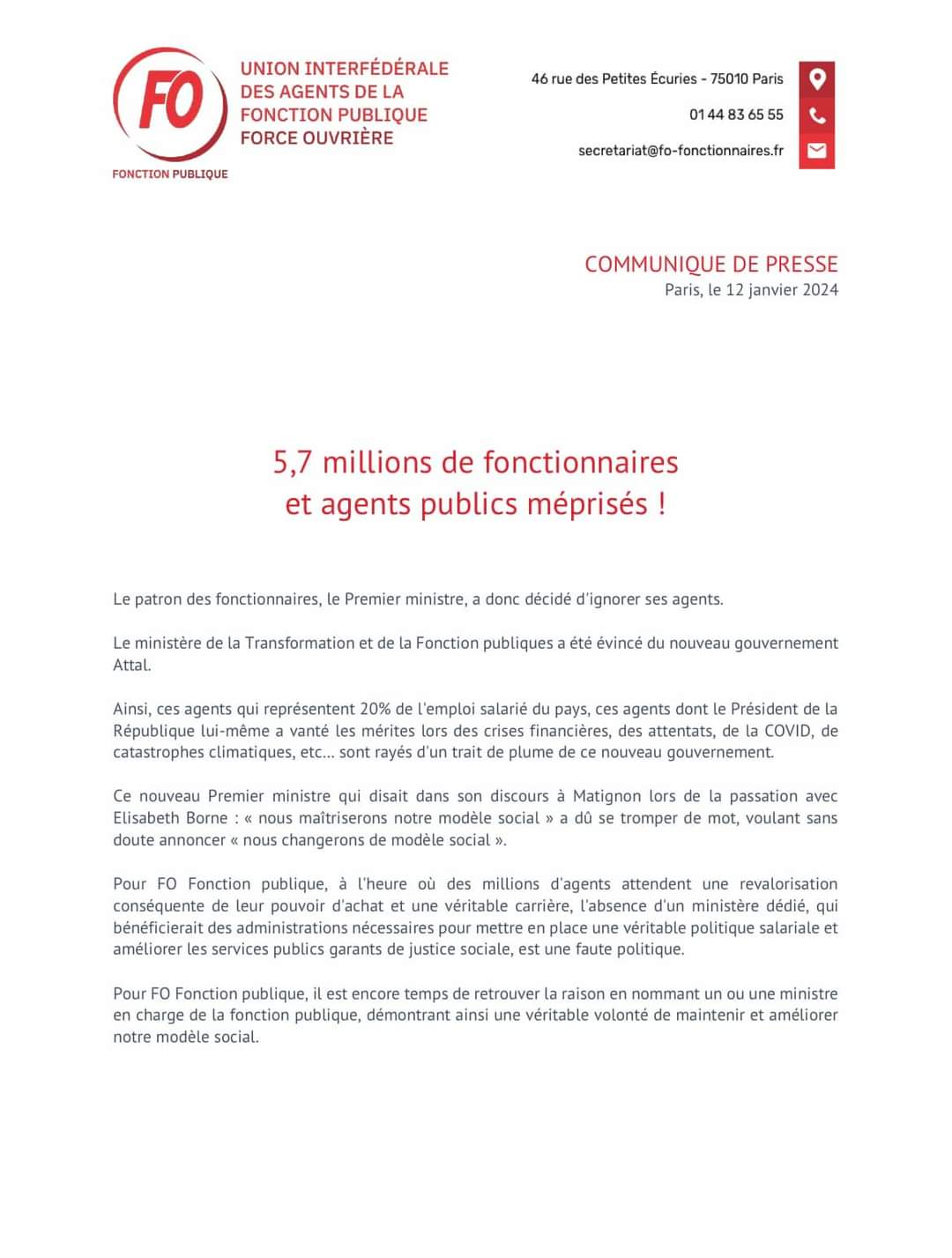 Le communiqué de Force Ouvrière Services Publics de Santé, Communiqué de presse FO - 12 janvier 2024 (format JPG - 81 Ko), met en lumière les préoccupations croissantes au sein du personnel hospitalier face à ces changements structurels. La transition vers un nouveau cadre ministériel soulève des interrogations quant à l'avenir des politiques de santé et de la fonction publique, en particulier dans un contexte post-COVID où la pression sur le système de santé est déjà palpable.