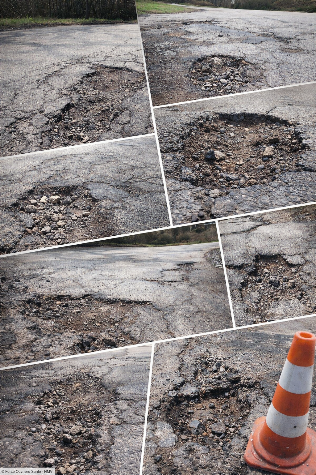 Nids-de-poule profonds, chaussée défoncée, affaissements visibles :