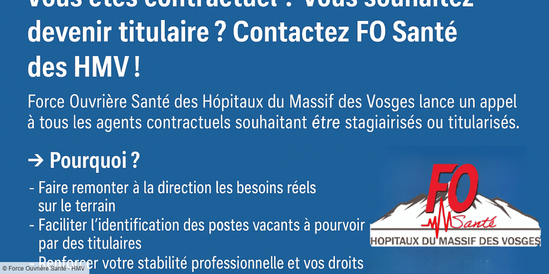 Force Ouvrière Santé des HMV lance un appel à tous les agents contractuels souhaitant être stagiairisés ou titularisés.