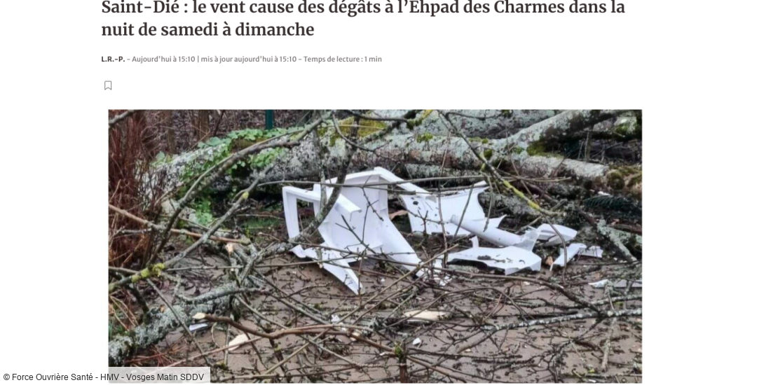 FO Santé des HMV se distingue avec un article sur le coup de vent de samedi à dimanche, publié à 10h13 sur son site et repris par Vosges Matin à...