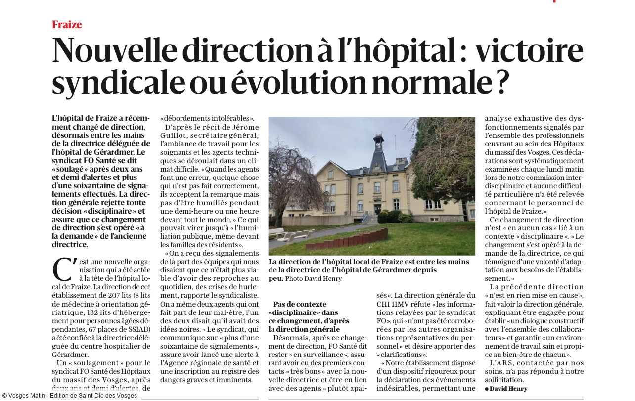 Un « soulagement » pour le syndicat FO Santé des Hôpitaux du massif des Vosges, après deux ans et demi d'alertes, de «débordements intolérables».