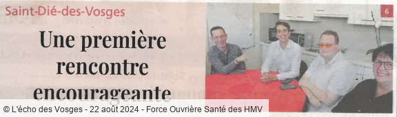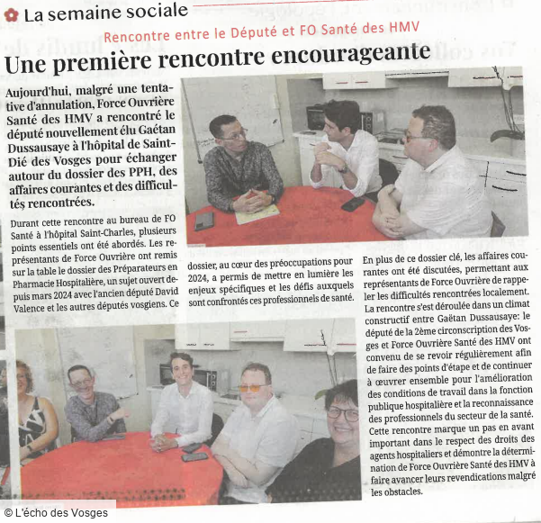 Le 22 août 2024, le journal hebdomadaire L'Écho des Vosges a publié un article relatant une rencontre importante qui a eu lieu au Centre Hospitalier de Saint-Dié-des-Vosges. À cette occasion, le Député Gaetan Dussausaye a rencontré les représentants de l'organisation syndicale Force Ouvrière Santé des HMV.